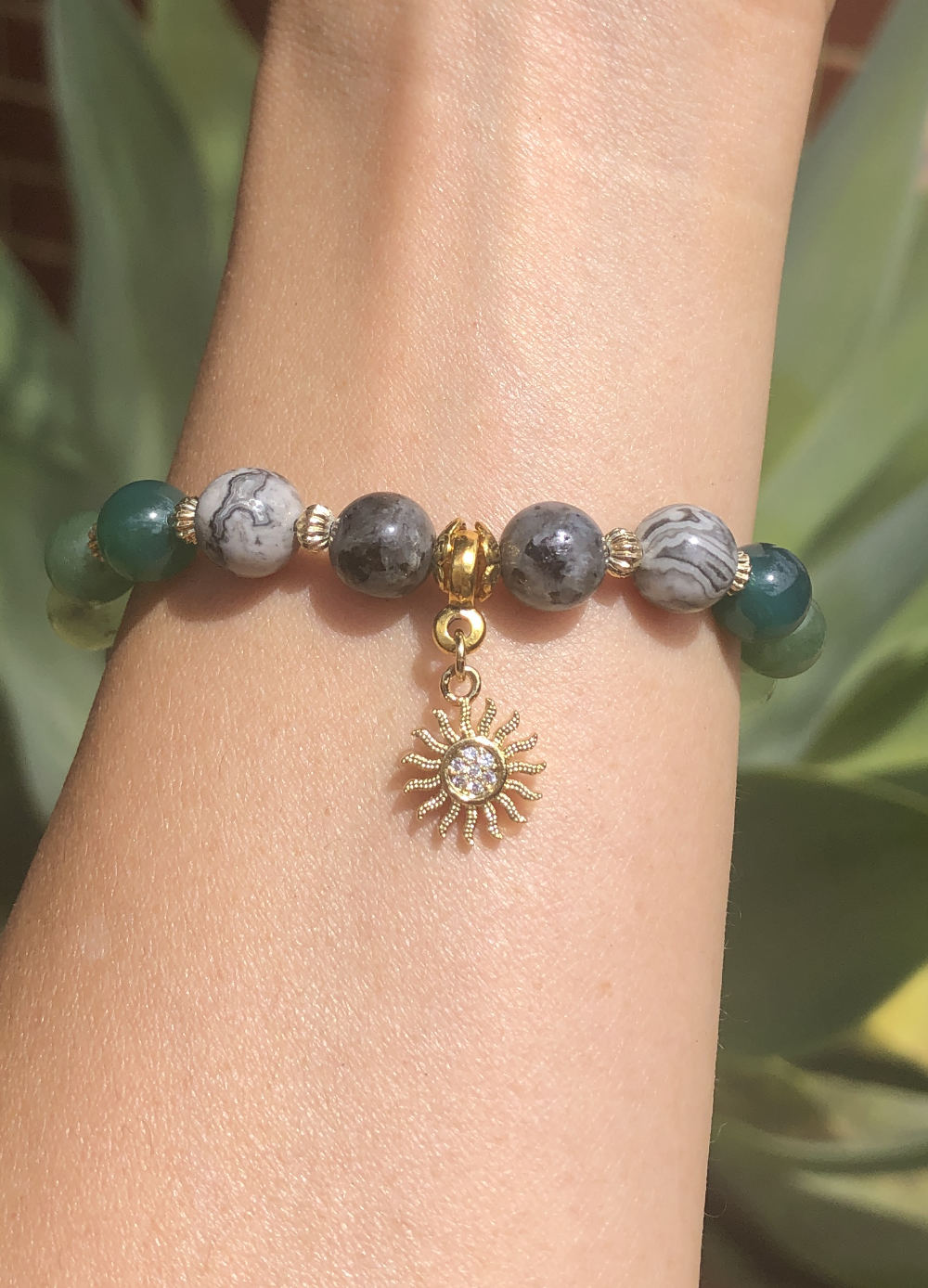 Each Capricorn Gemstone Bracelet is handcrafted using a selection of natural gemstone beads chosen to reflect the Capricorn colour palette. Stone combinations may vary slightly over time while remaining true to the same tonal range. Commonly used stones include Jasper, Aventurine, Jade, and Quartz.