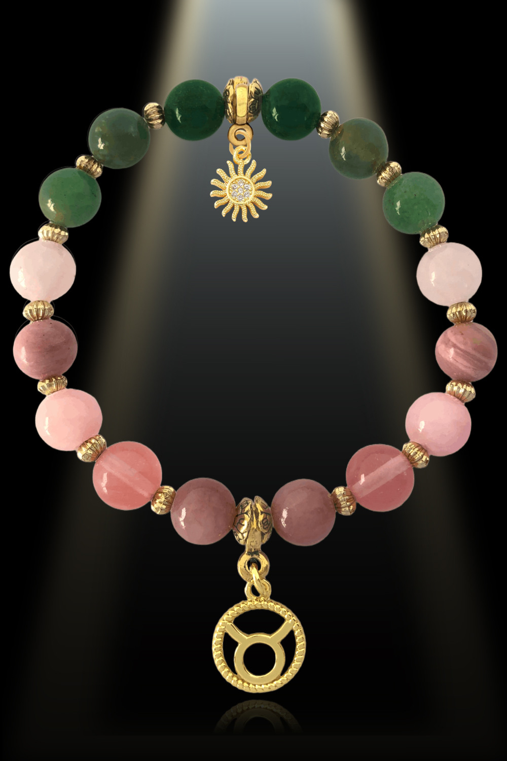 Each Taurus Gemstone Bracelet is handcrafted using natural gemstone beads chosen to reflect the Taurus colour palette. While stone combinations may vary slightly over time, they remain within the same tonal range. Commonly used stones include Jade, Aventurine, and Quartz.